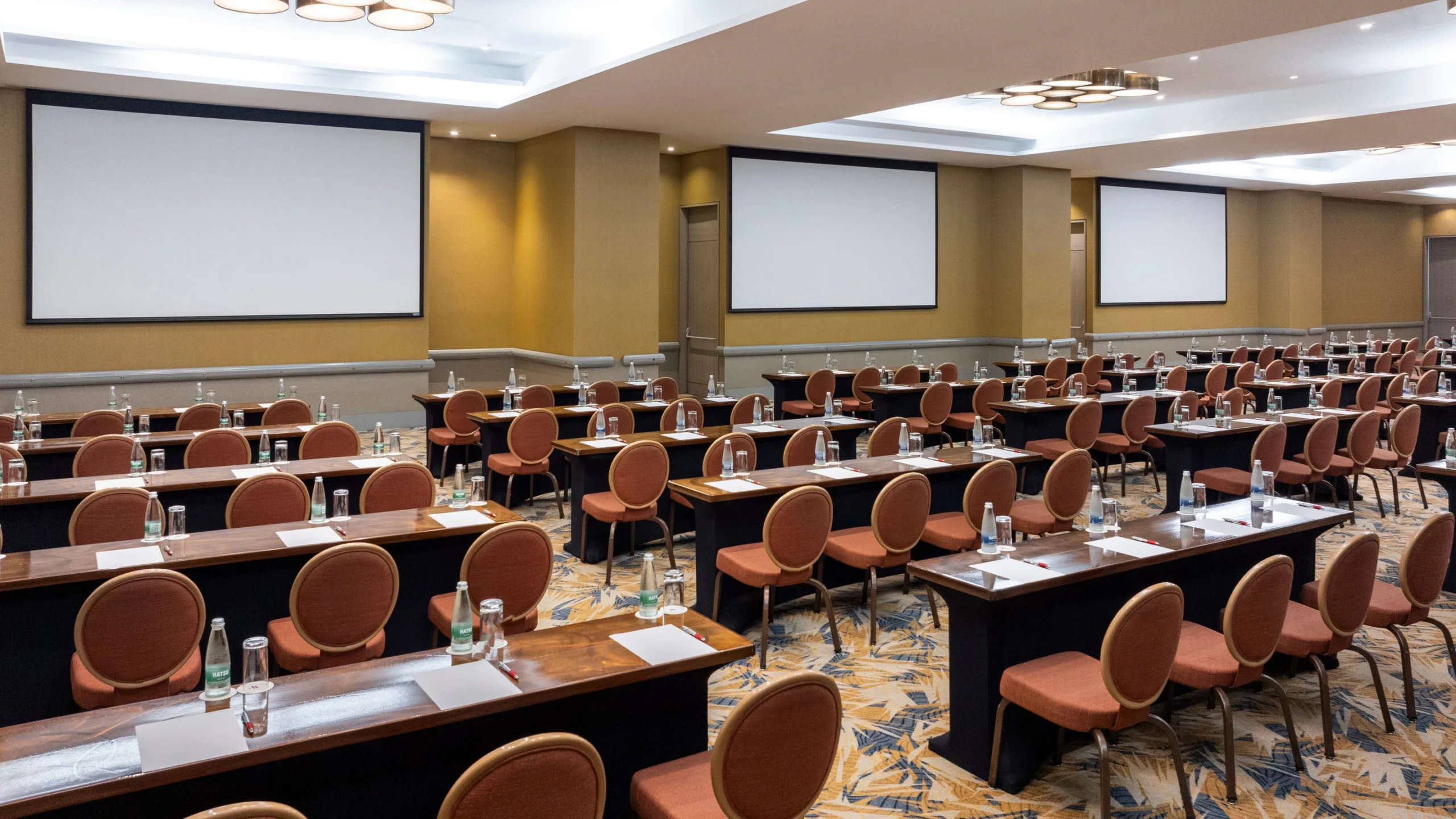 La disposición ideal para conferencias de tamaño mediano y grande. Requiere de una sala relativamente grande. Las mesas ofrecen a los asistentes un espacio para extender el material y tomar notas.